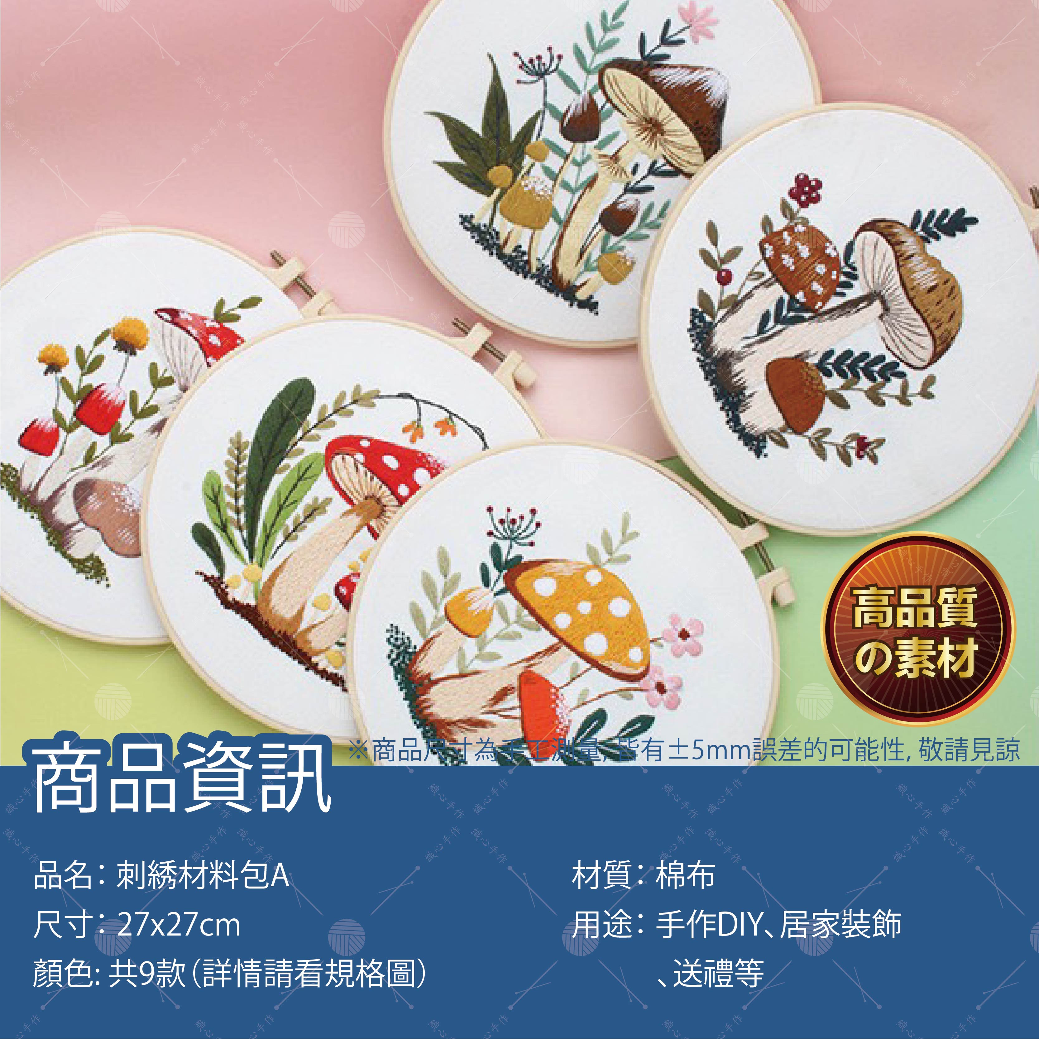 【商品規格】品名:刺綉材料包A顏色:共9款(詳情請看規格圖)材質:棉布尺寸: 27x27cm用途: 手作DIY、居家裝飾、送禮等。