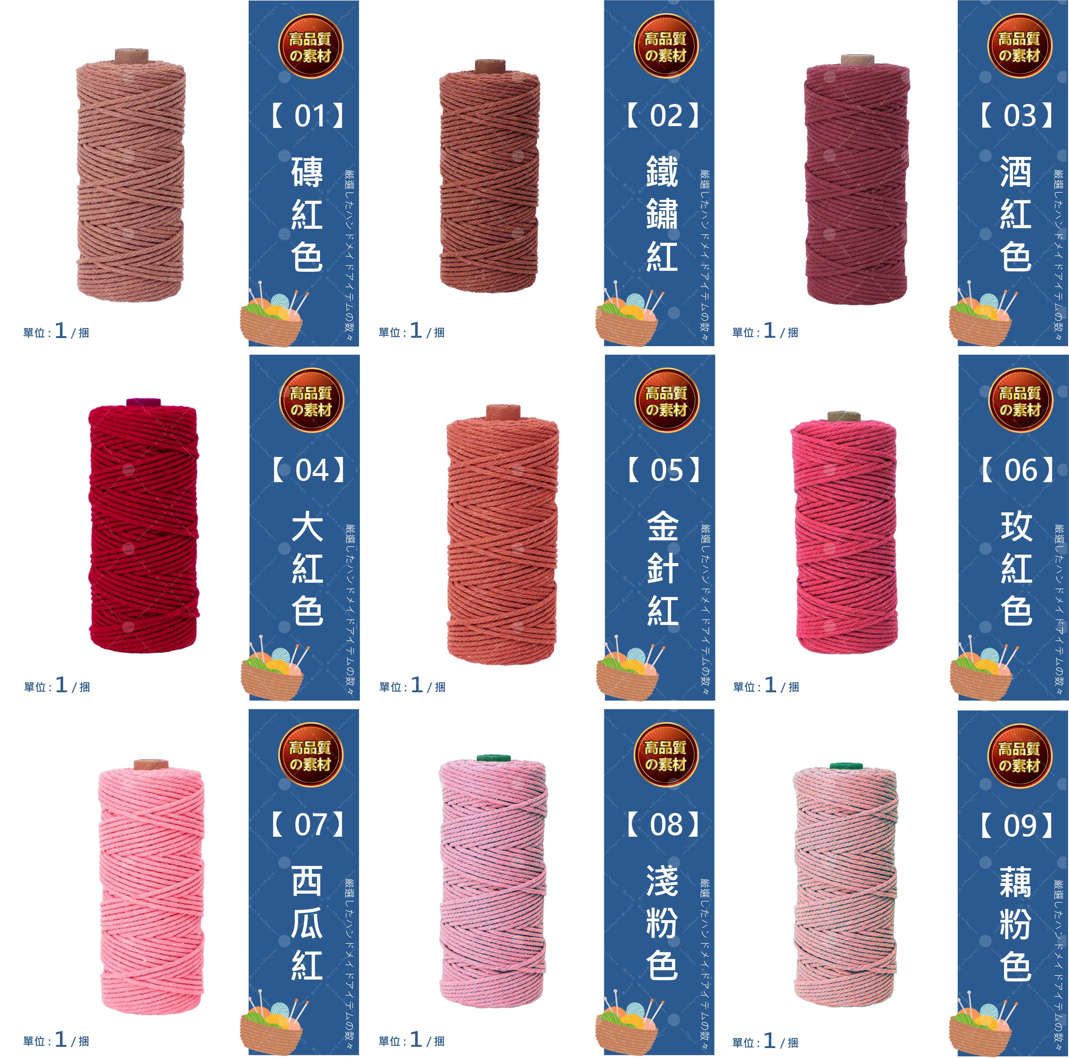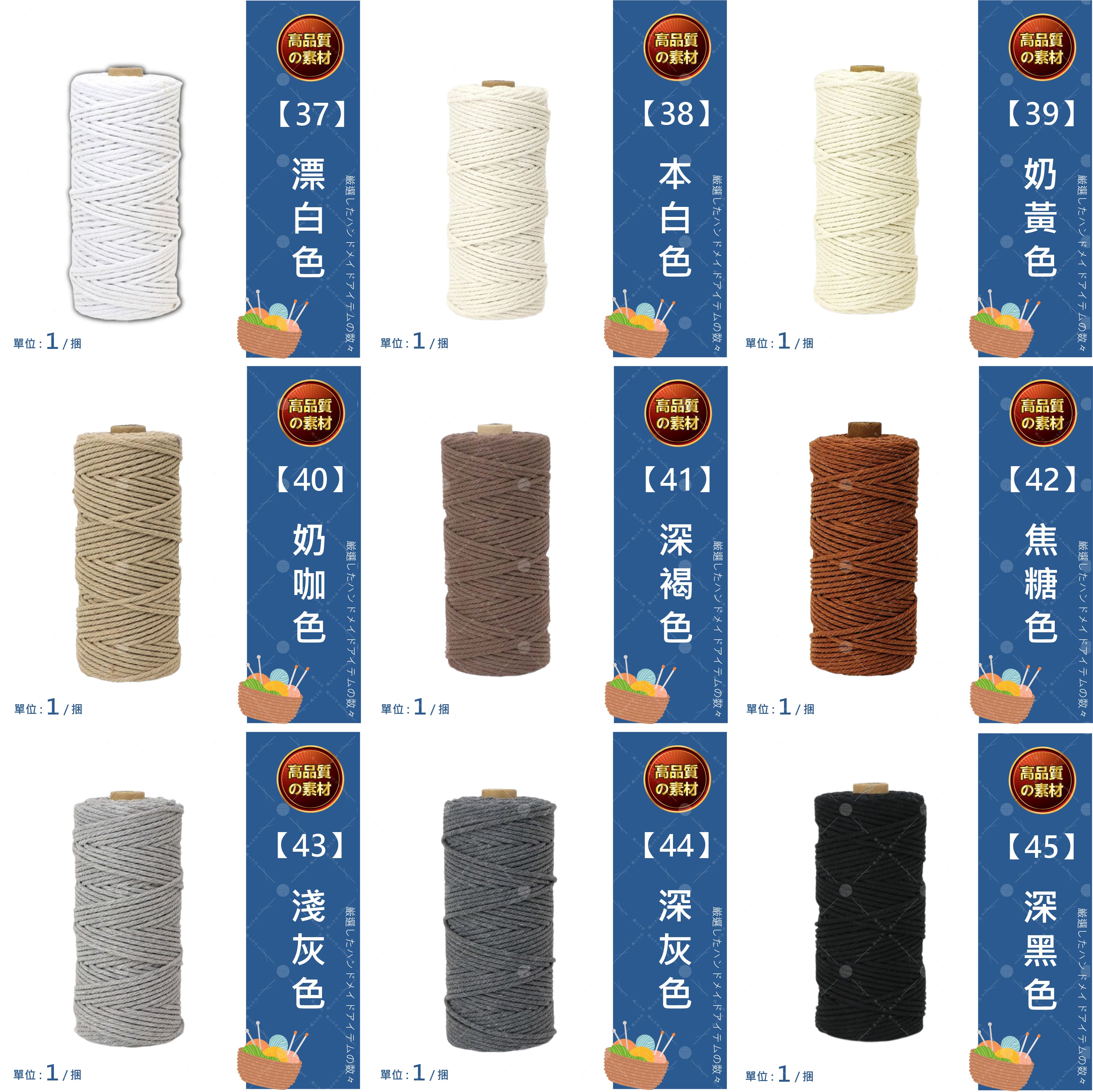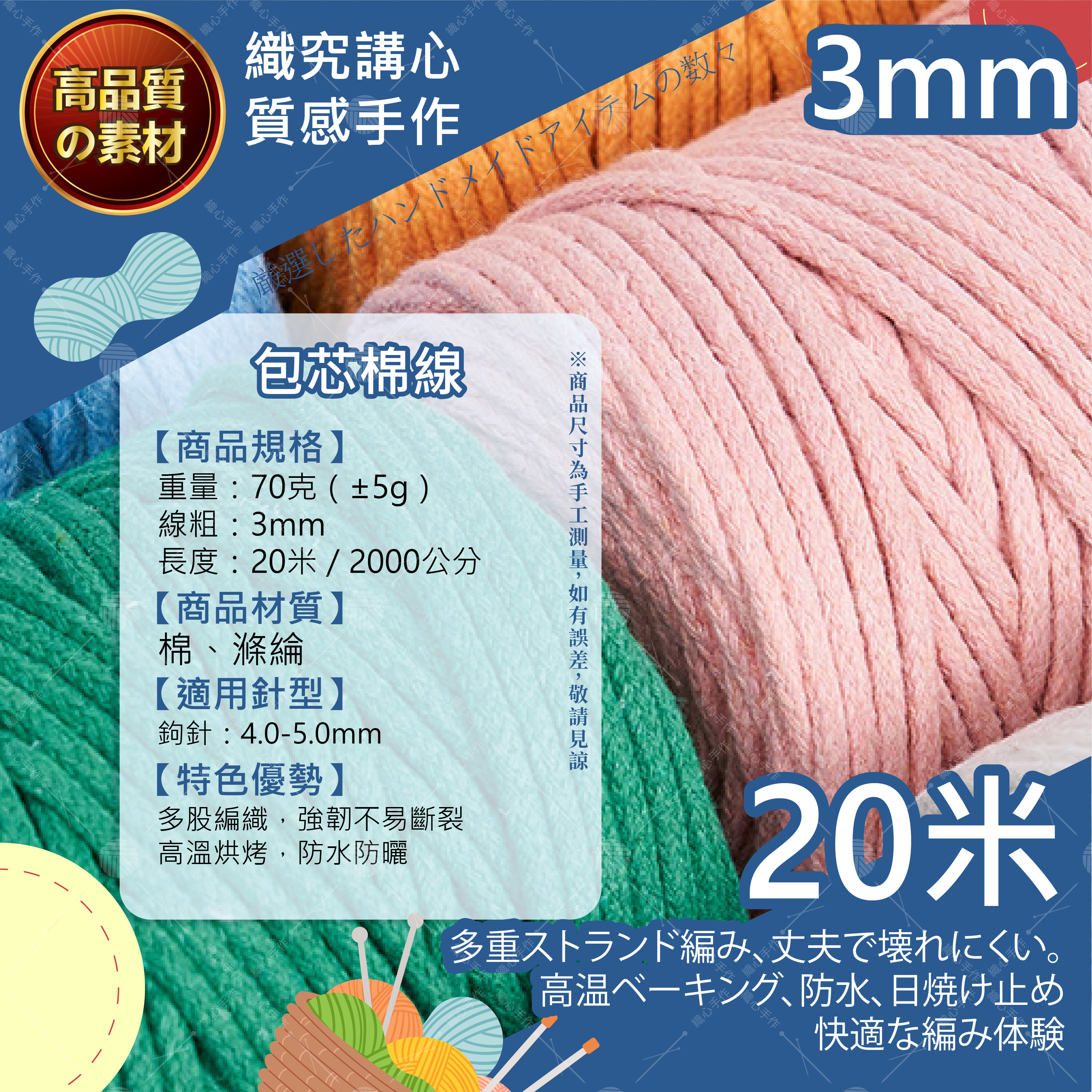 🔷 產品名稱 : 包芯棉線 3mm 20米🔷 產品款式 : 全系列47色(詳見下方規格圖及實體照)🔷 產品尺寸 : 厚度約3mm,每卷長約2000公分🔷 產品重量 : 每卷約70克(±5克)🔷 產品材質 : 棉、滌綸🔷 產品優勢 : 棉線質地細膩而扎實,編織時順手不易鬆散。粗細均勻,具有結實的抗拉性,適用於各種手工編織項目。 🔷 產品用途 : 適用於編織包包、吊籃、掛毯、鍋墊、杯墊等多種手作項目。