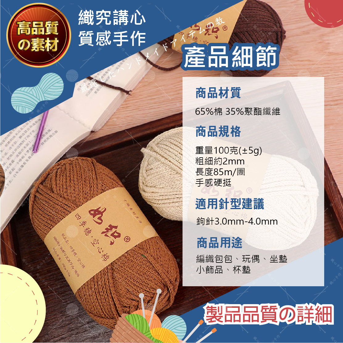 🔷 商品名稱:2mm圓股空心棉線🔷 商品款式:共30色,(詳情請看規格圖)🔷 商品尺寸:繩徑約2mm,長度約85米(相當於8500公分)🔷 商品重量:約100克(±5g)🔷 商品材質:65%棉,35%聚脂纖維🔷 商品優勢:細膩堅固,編織時順暢不易散開 粗細均勻,拉力強韌🔷 商品說明:適用於編織包包、吊籃、掛毯、鍋墊、杯墊、玩偶、小飾品等等