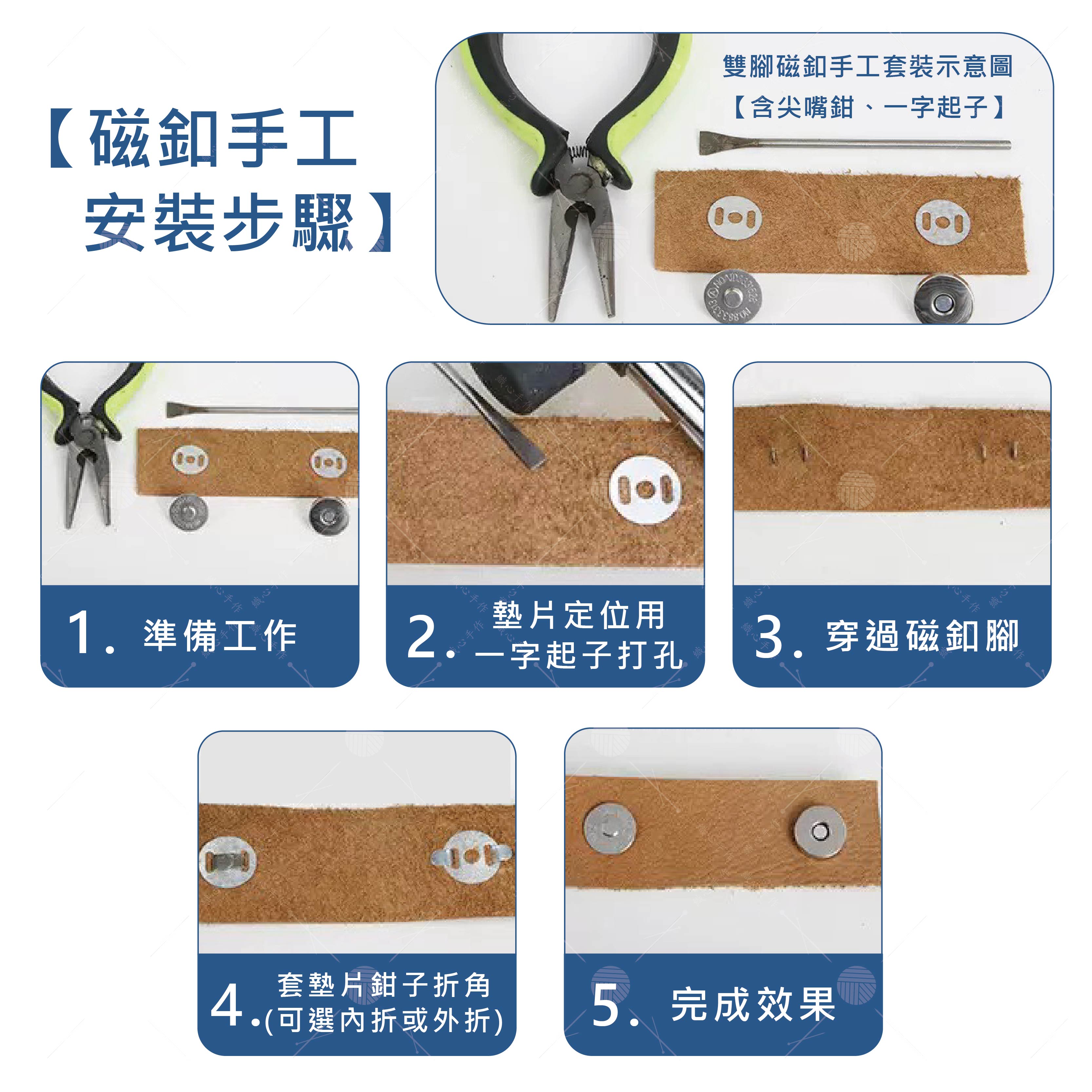 用途: 磁吸式扣子簡約方便,用尖嘴鉗即可裝訂完成 ♪