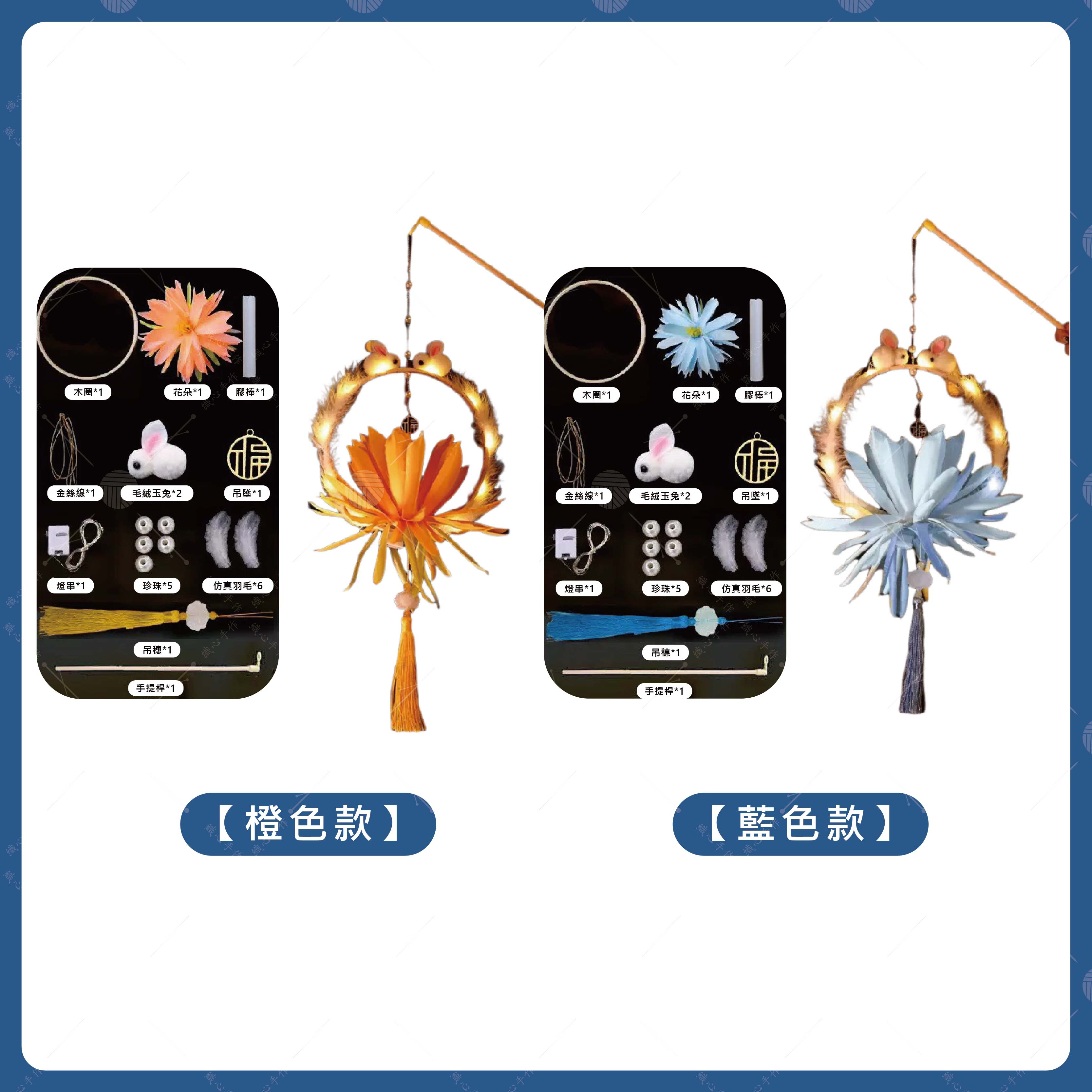 【商品規格】品名:玉兔手提燈籠材料包顏色:共2款(詳情請看規格圖)尺寸:50x26cm材質:木質用途:手作課程、穿搭配飾、拍照道具、節慶活動。