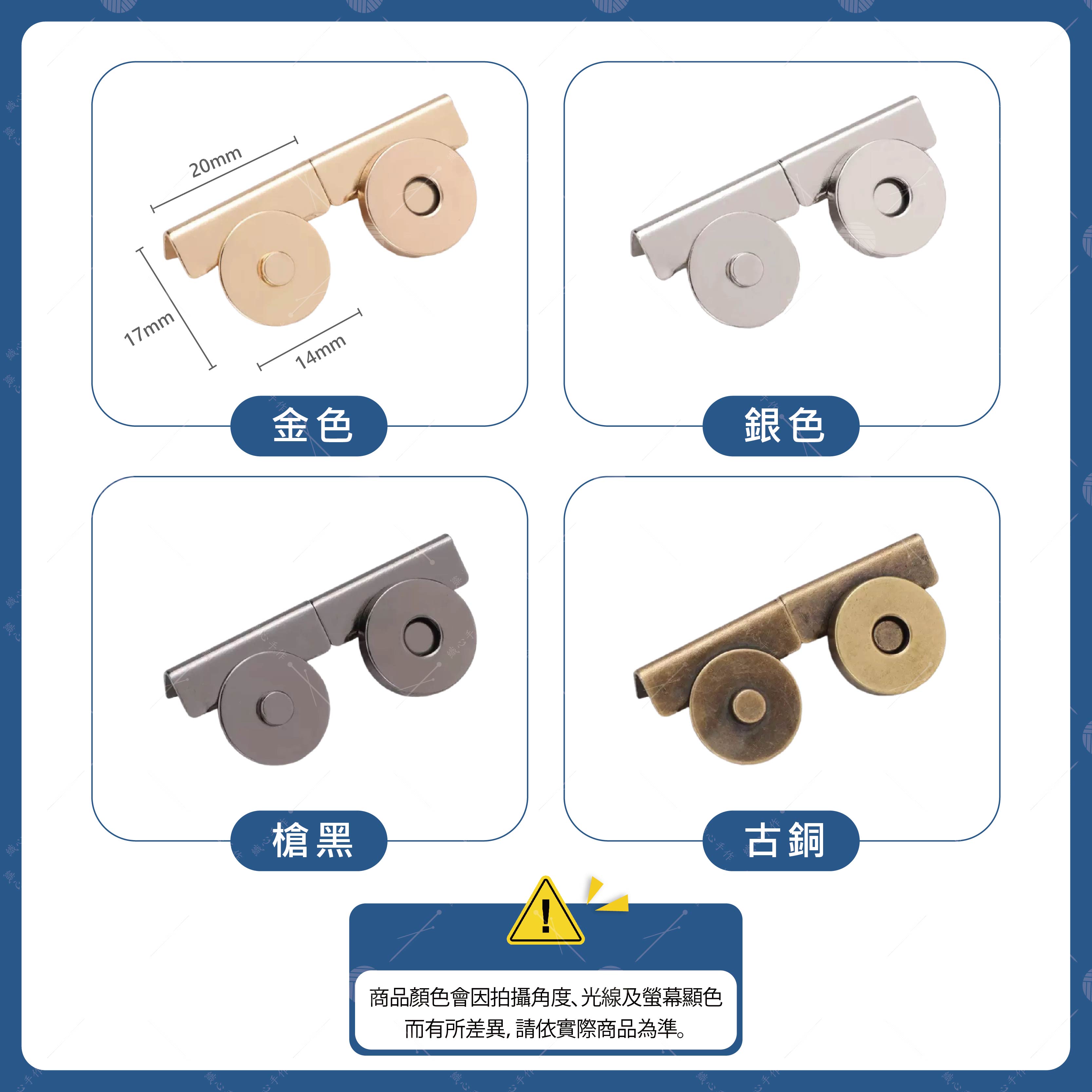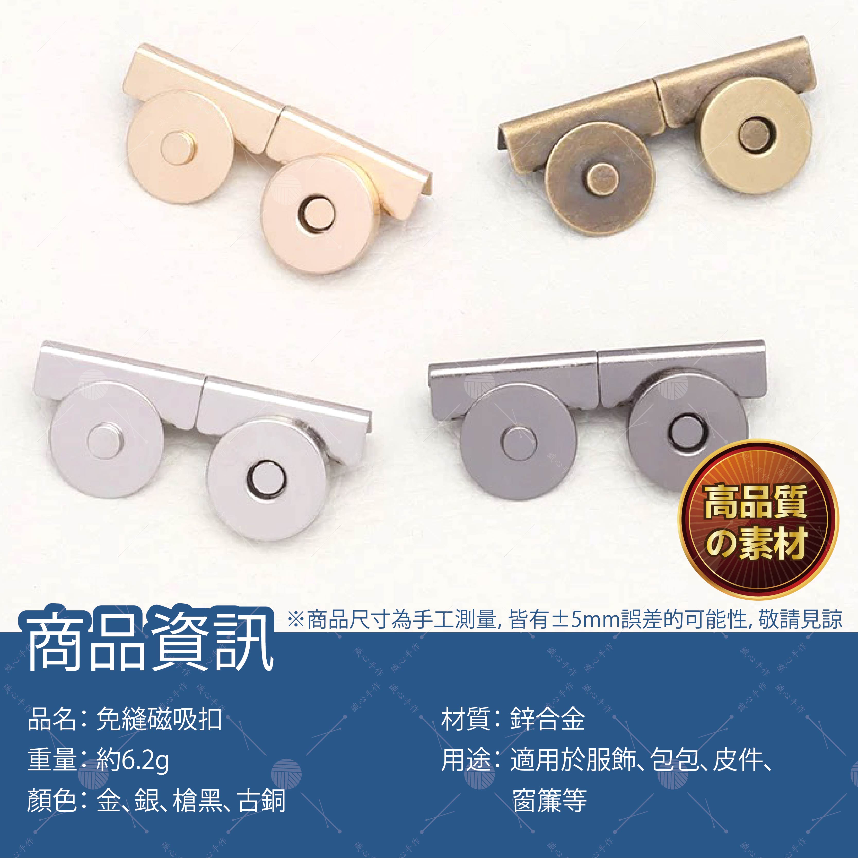 【商品規格】品名:免縫磁吸扣顏色:金、銀、槍黑、古銅重量: 約6.2克(±2g)材質:鋅合金用途: 適用於服飾、包包、皮件、窗簾等。