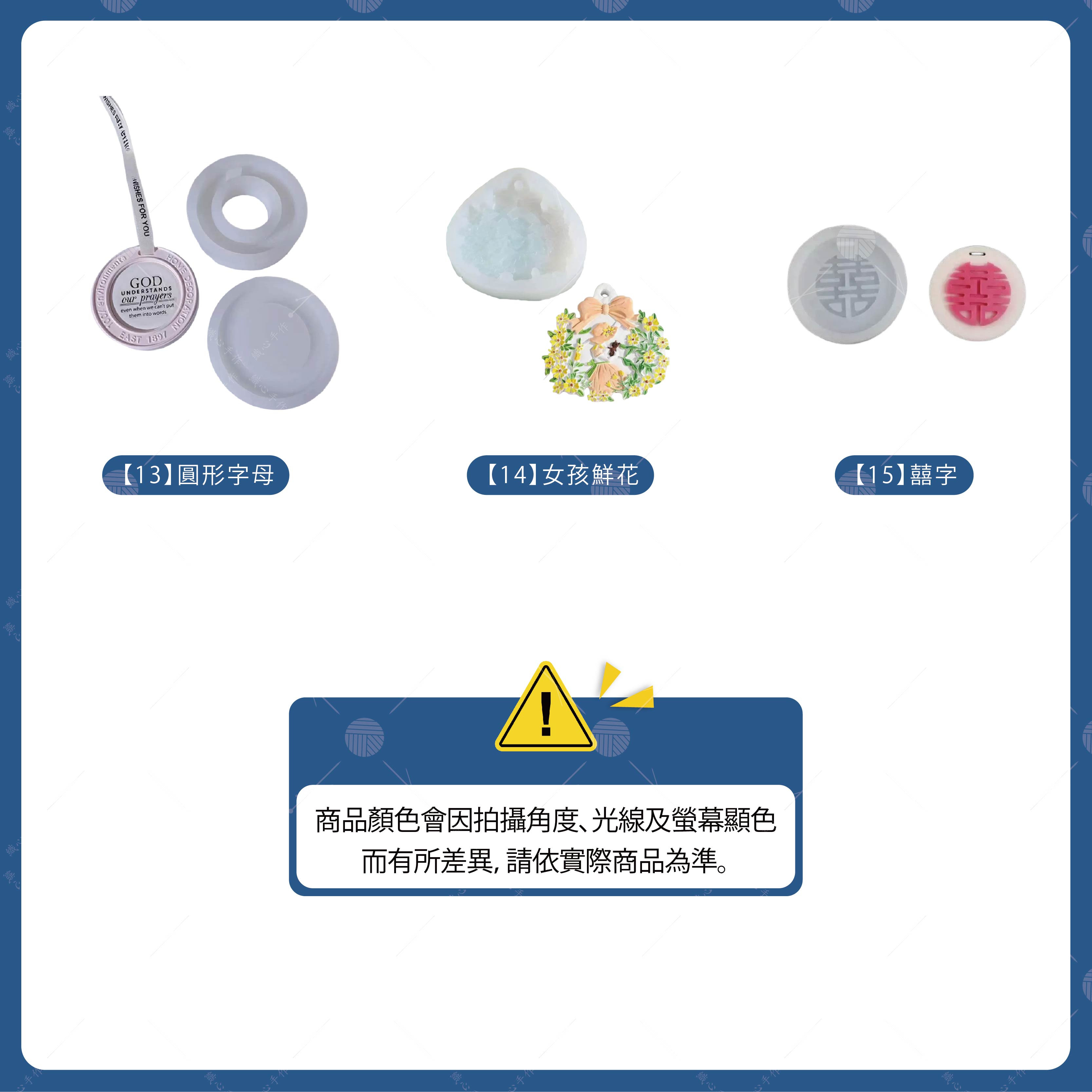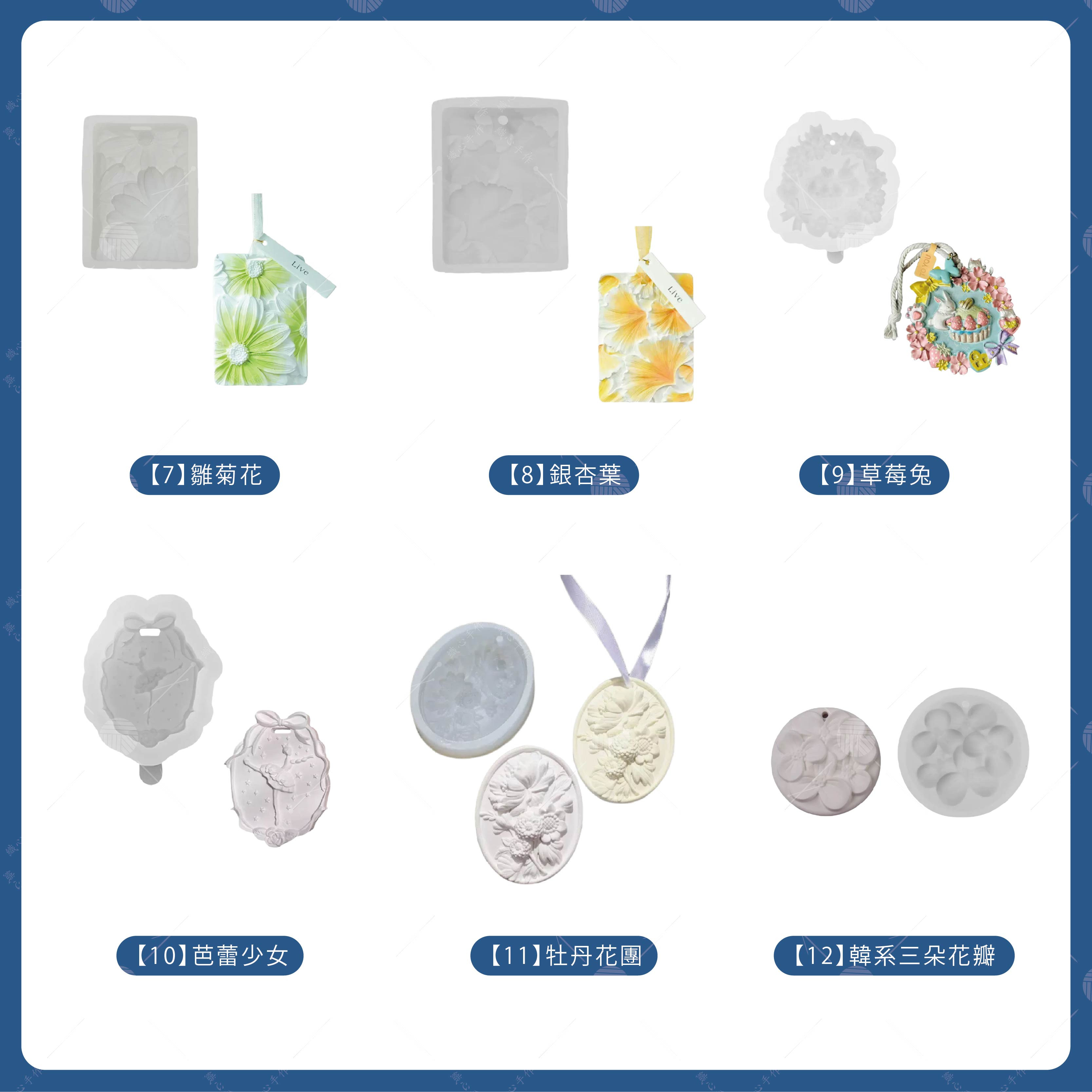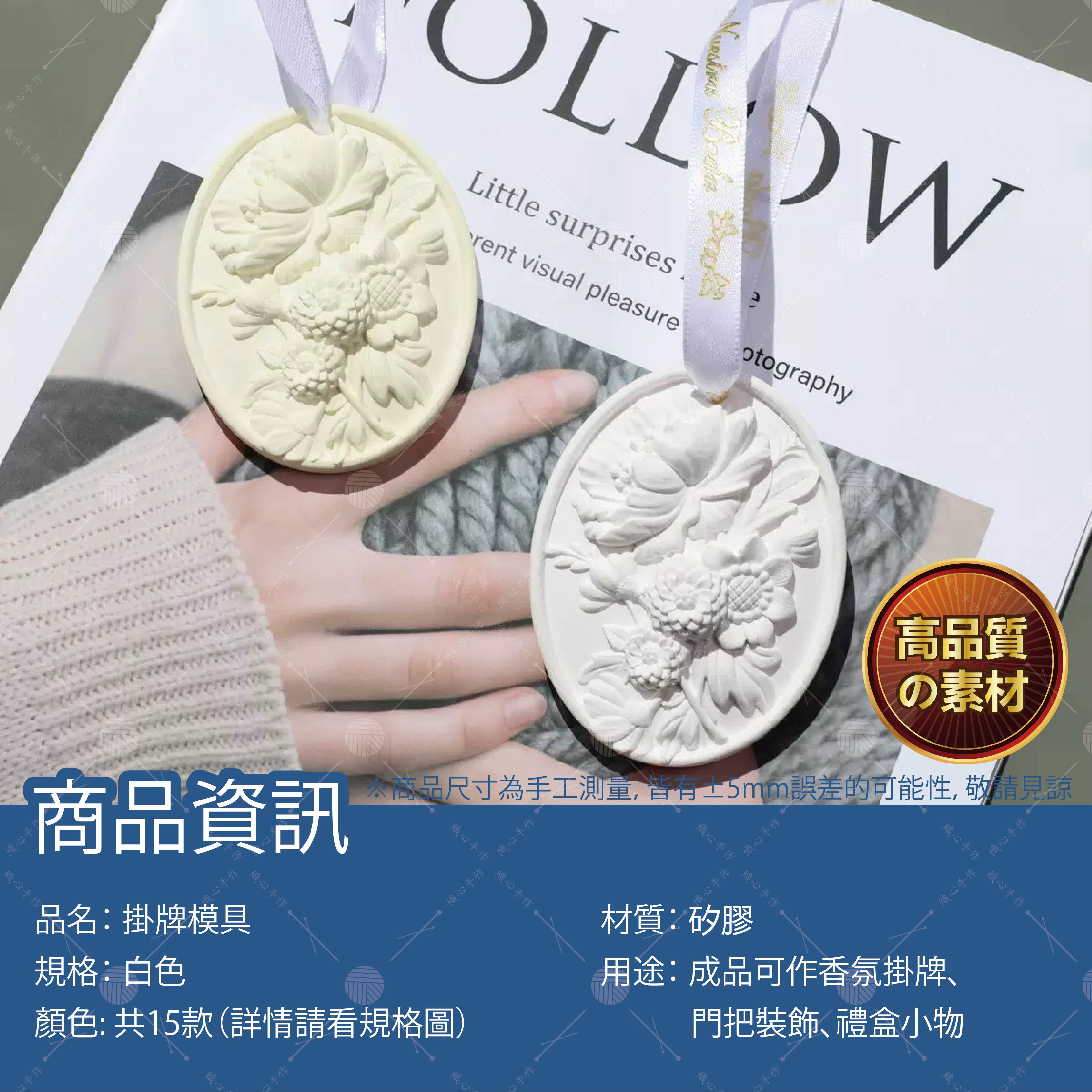 【商品規格】品名:掛牌模具顏色:共15款(詳情請看規格圖)材質:矽膠規格: 白色用途: 成品可作香氛掛牌、門把裝飾、禮盒小物。