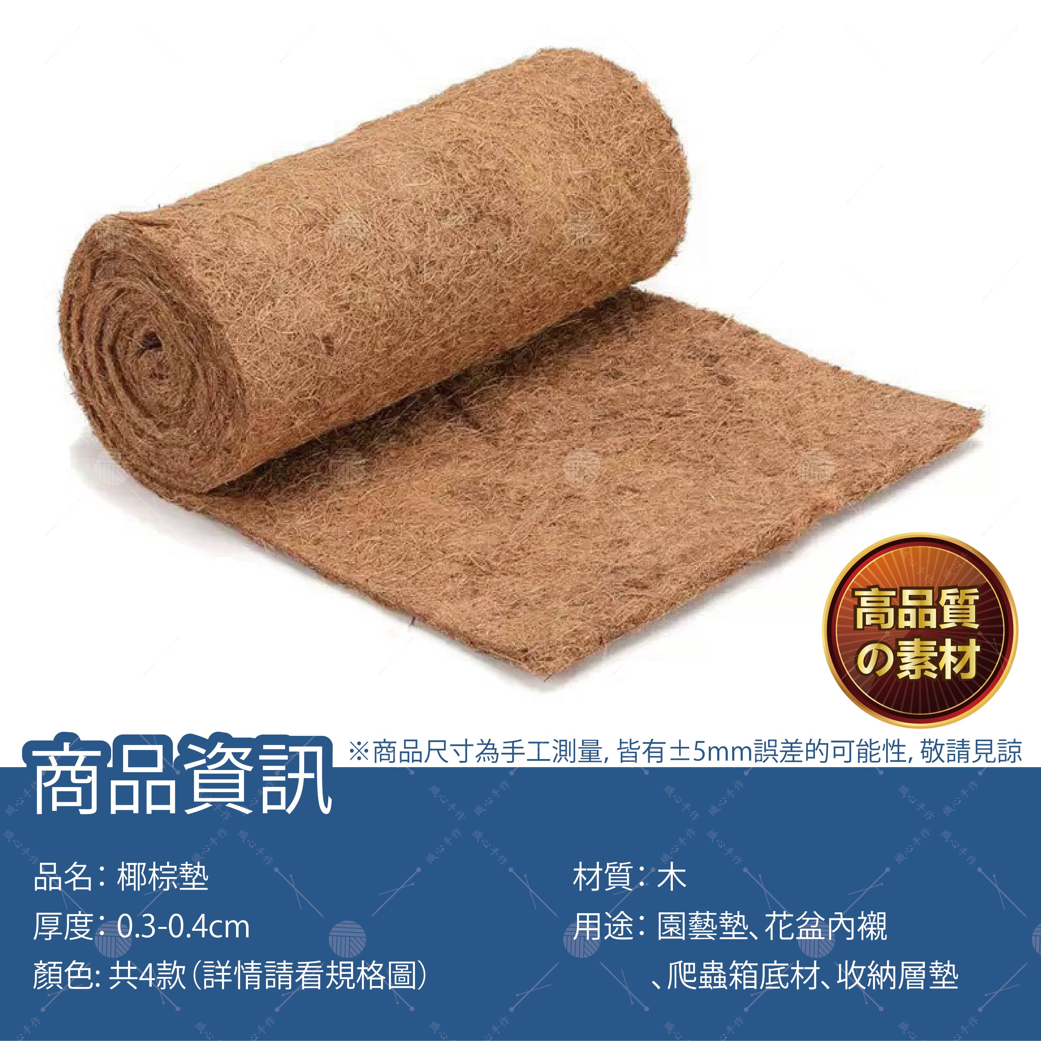 【商品規格】品名:椰棕墊顏色:共4款(詳情請看規格圖)材質:木厚度: 0.3-0.4cm用途: 園藝墊、花盆內襯 、爬蟲箱底材、收納層墊。