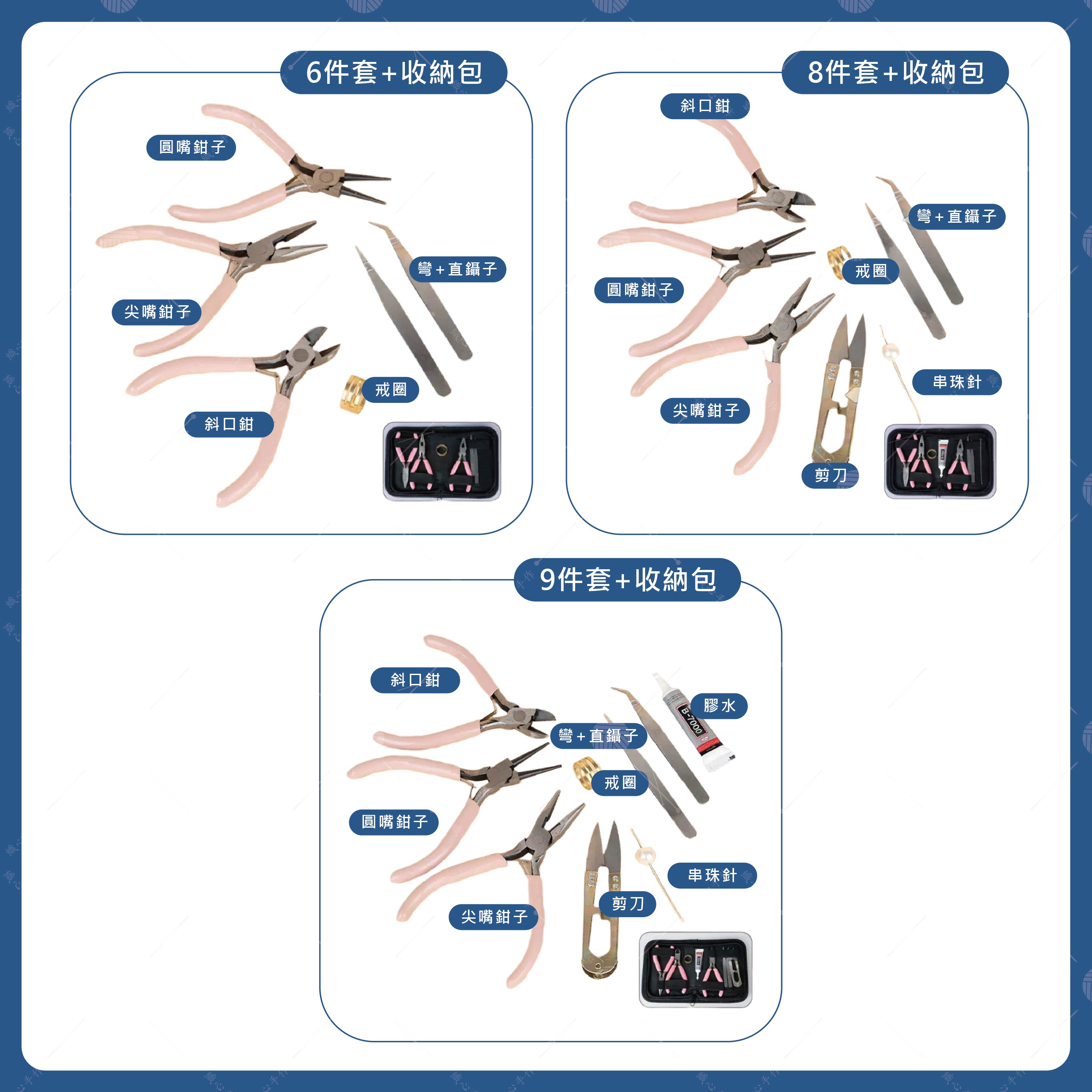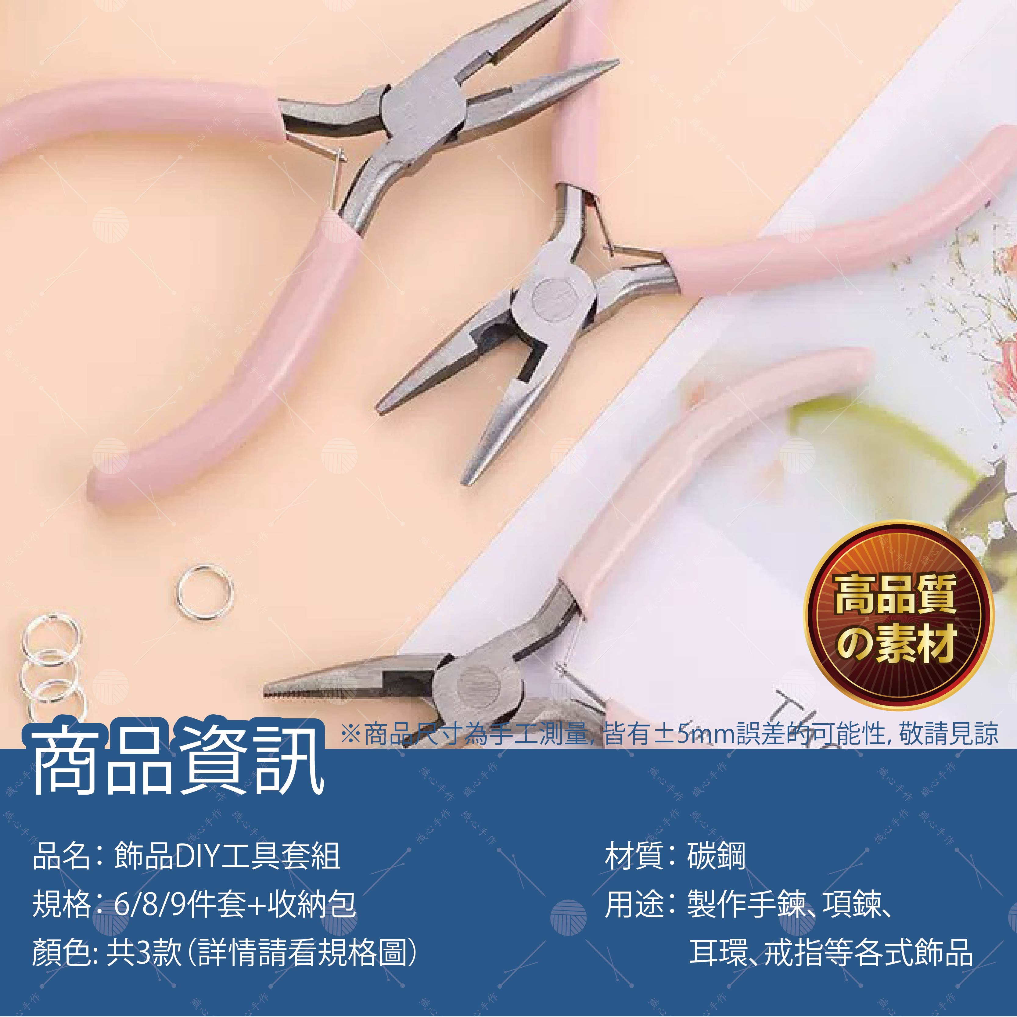 【商品規格】品名:飾品DIY工具套組規格: 6件套/8件套/9件套材質: 碳鋼用途: 製作手鍊、項鍊、耳環、戒指等各式飾品。